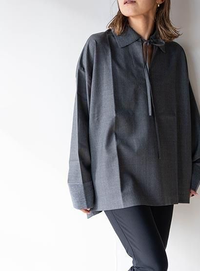 スキッパーの首元と、チャコールグレーの深い色味でハンサムな印象に仕上がっています。